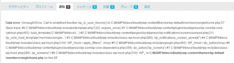 Fatalエラーです。焦って検索してみたところ廃止されている関数bp_is_user_forumsを使っていることが原因でこのあたりの行をコメントすれば直るようでした。