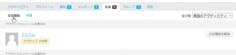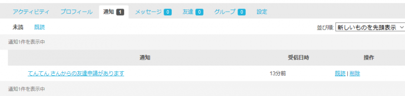 交友関係をクリックすると、「てんてん」さんが表示されました。
