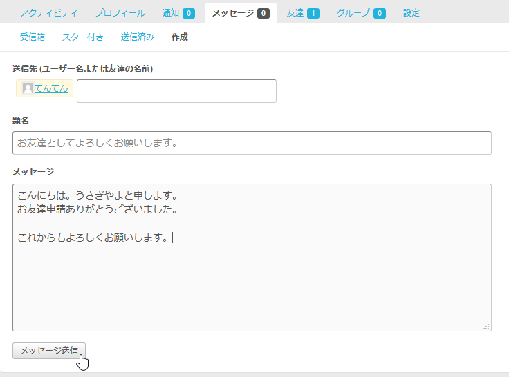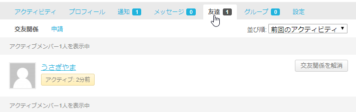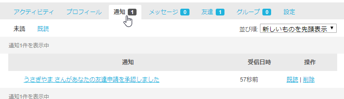 友達タブをクリックすると「うさぎやま」さんが表示されました。