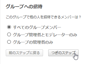 グループへの招待という部分がありますので、作りたいグループに合う設定を選んでつぎのステップをクリックします。