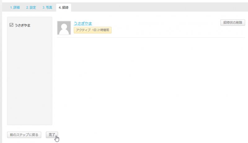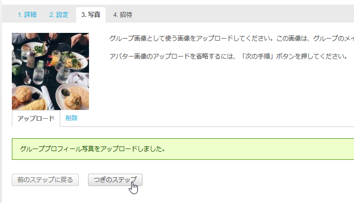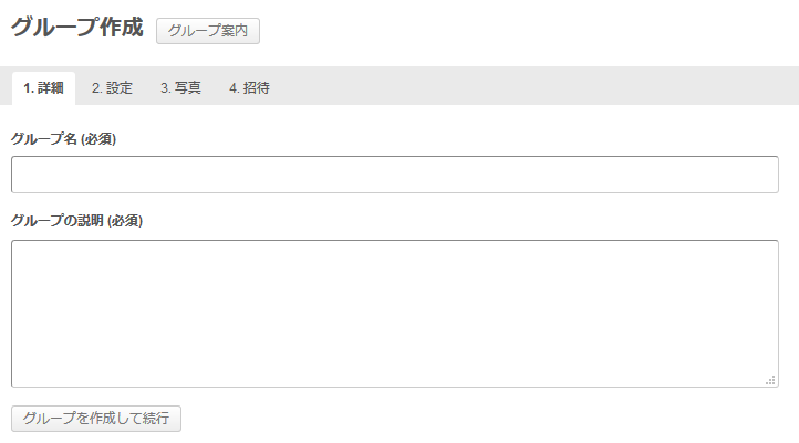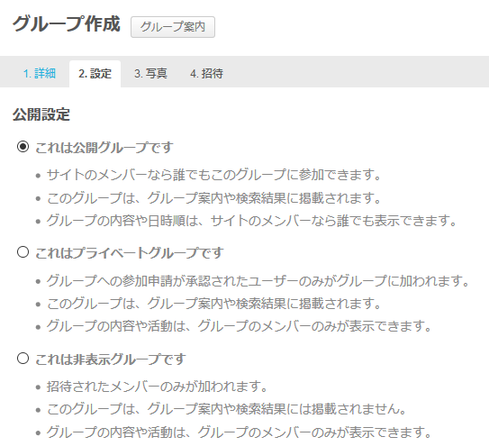 このような画面が表示されます。上部に1. 詳細、2. 設定、3. 写真、4. 招待というタブがあります。この4画面に渡って設定をしていくということになります。