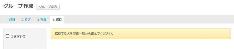 グループへ招待する人を選びます。既に友達になっている人が表示されます。招待したい人の名前にチェックを付けて
