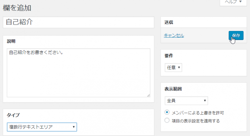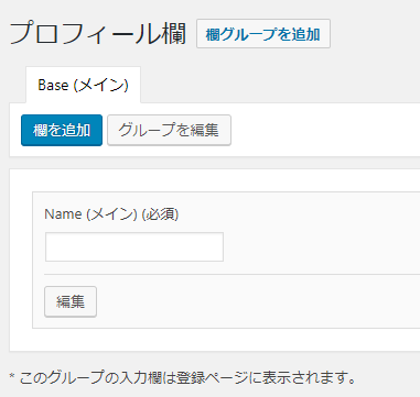 ここで、さらに追加のプロフィールについて入力してもらえるようにしてみます。また最初から入っている項目名もラベルを修正します。
