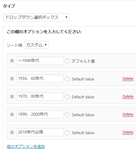 ドロップダウン選択ボックスを選んで、選択肢を複数入力して、