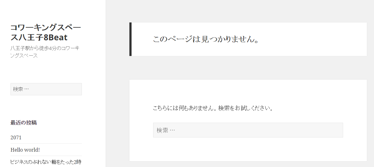 こんな感じに404エラーページと言われるものが表示されます。404エラーとは「指定されたURLのページは存在していません」というエラーです。