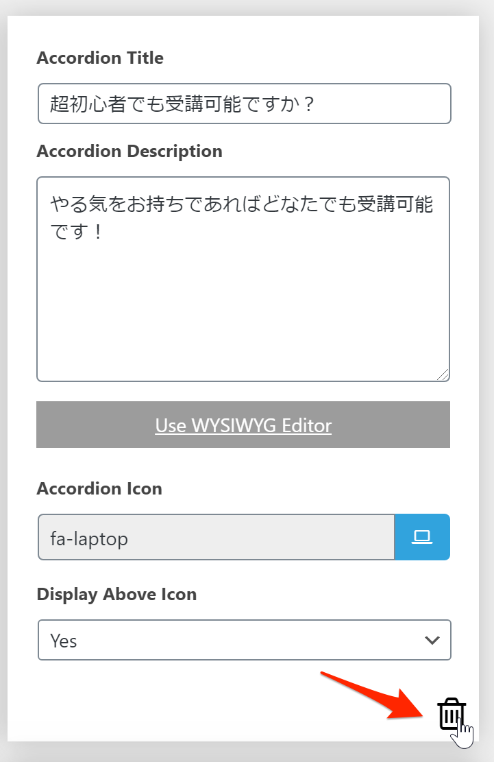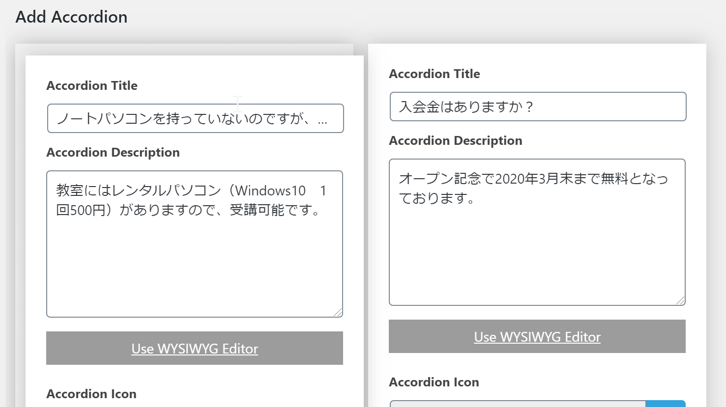 その下にあるAdd Accordionの部分に1つずつの質問と答えを入力していきます。