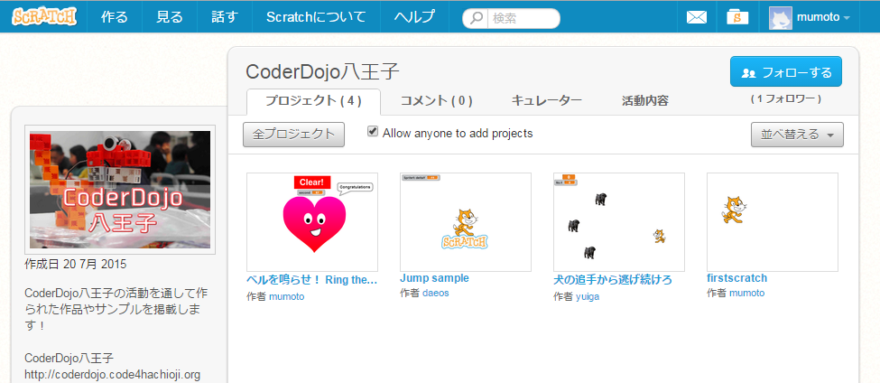 まだ少ししか作品を載せていませんが、スタジオという機能を使ってCoderDojo八王子で作るような作品や、メンターがサンプルとして作った作品を載せた CoderDojo八王子スタジオ を作りました。