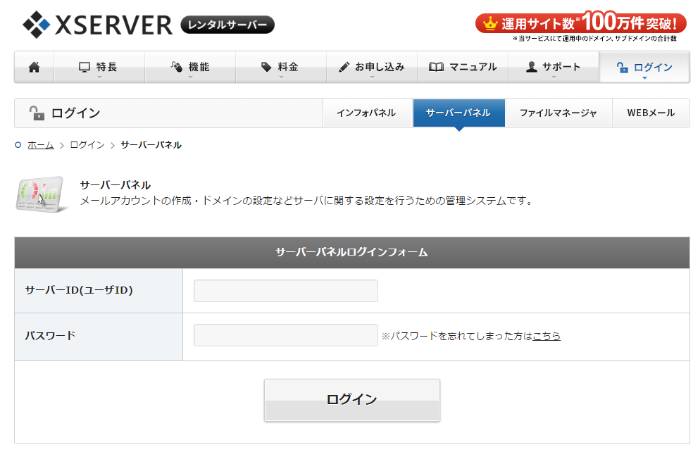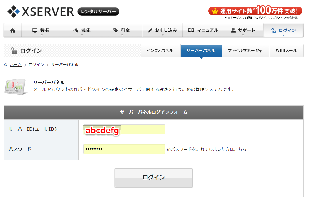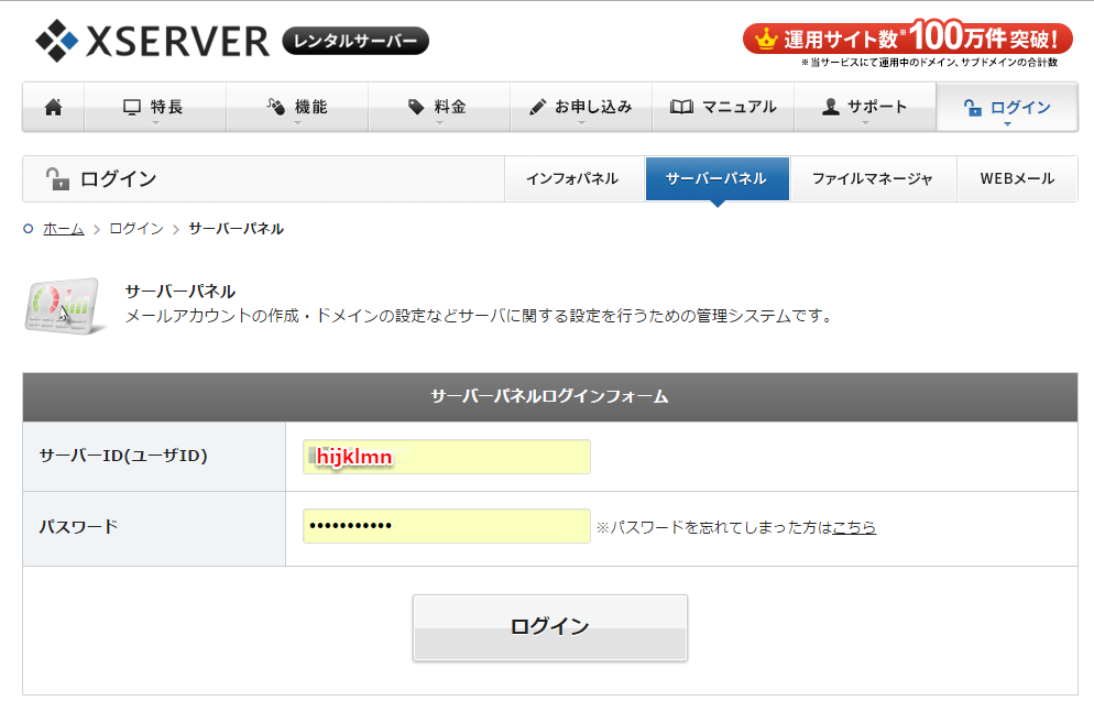 このようにIDとパスワードが入っていますので、ログインをクリックしただけですぐにサーバーパネルに入れるようになります(^^)/