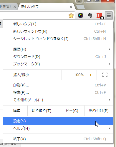 chromeブラウザの右上にあるメニューのマークをクリックします