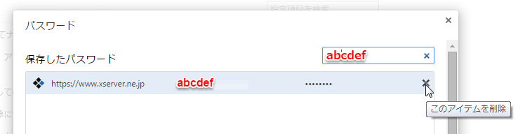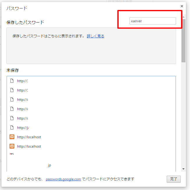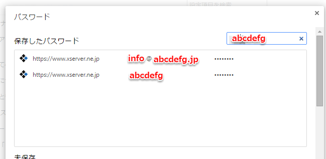 保存したパスワード に XSERVER と入力するとこのように一覧が出ます。表示されたこの未保存の一覧の中からXSERVERのURLを探します
