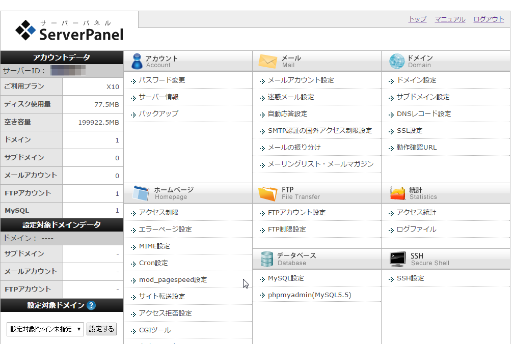 サーバーパネルに入ります。これで再度、chromeを閉じてログイン画面に来たときは、
