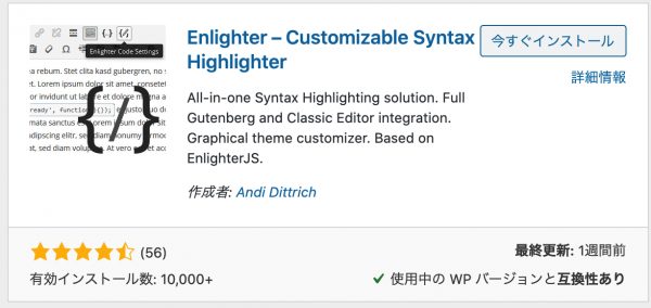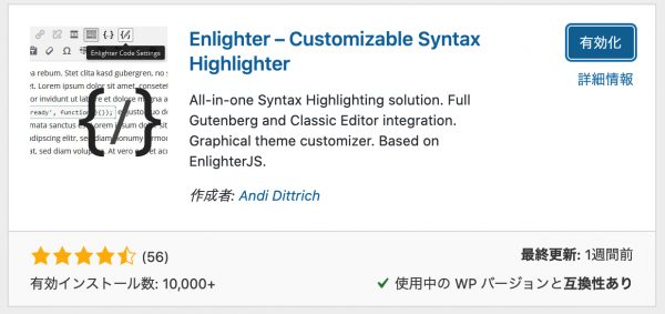 ということで、今回は新しいプラグインEnlighter – Customizable Syntax Highlighterを使って、グーテンベルグなどでも使ってみます。
