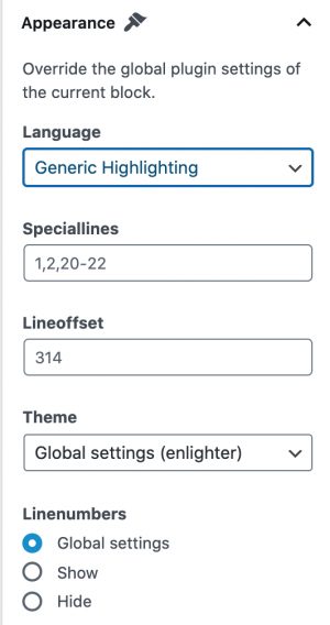Enlighterにはオプションがいろいろついています。編集画面の右ブロックを見ると、
