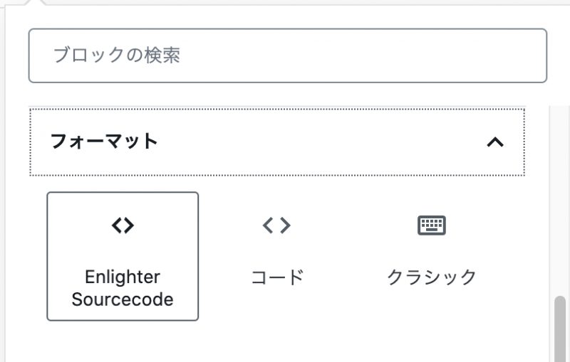 フォーマットというタブの中にEnlighter Sourcecodeというブロックがありますので、クリックします。