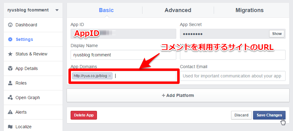 App Domains にFacebookコメントを使うサイトのURLを入力して、Save Changesをクリック。