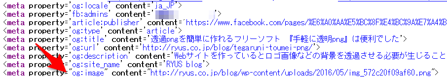 こんな感じにOGPが指定してあり、 og:image で指定してある画像がOGP画像です。このようにちゃんと指定してあってもまれにFacebookではこのOGP画像が認識されないことがあります。