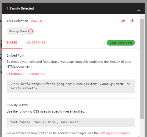 この画面が表示されます。ここにはGoogle Fontsを利用するために必要なLink記述とフォントの指定方法が書いてあります。あとで使いますのでこのままにしておきます。