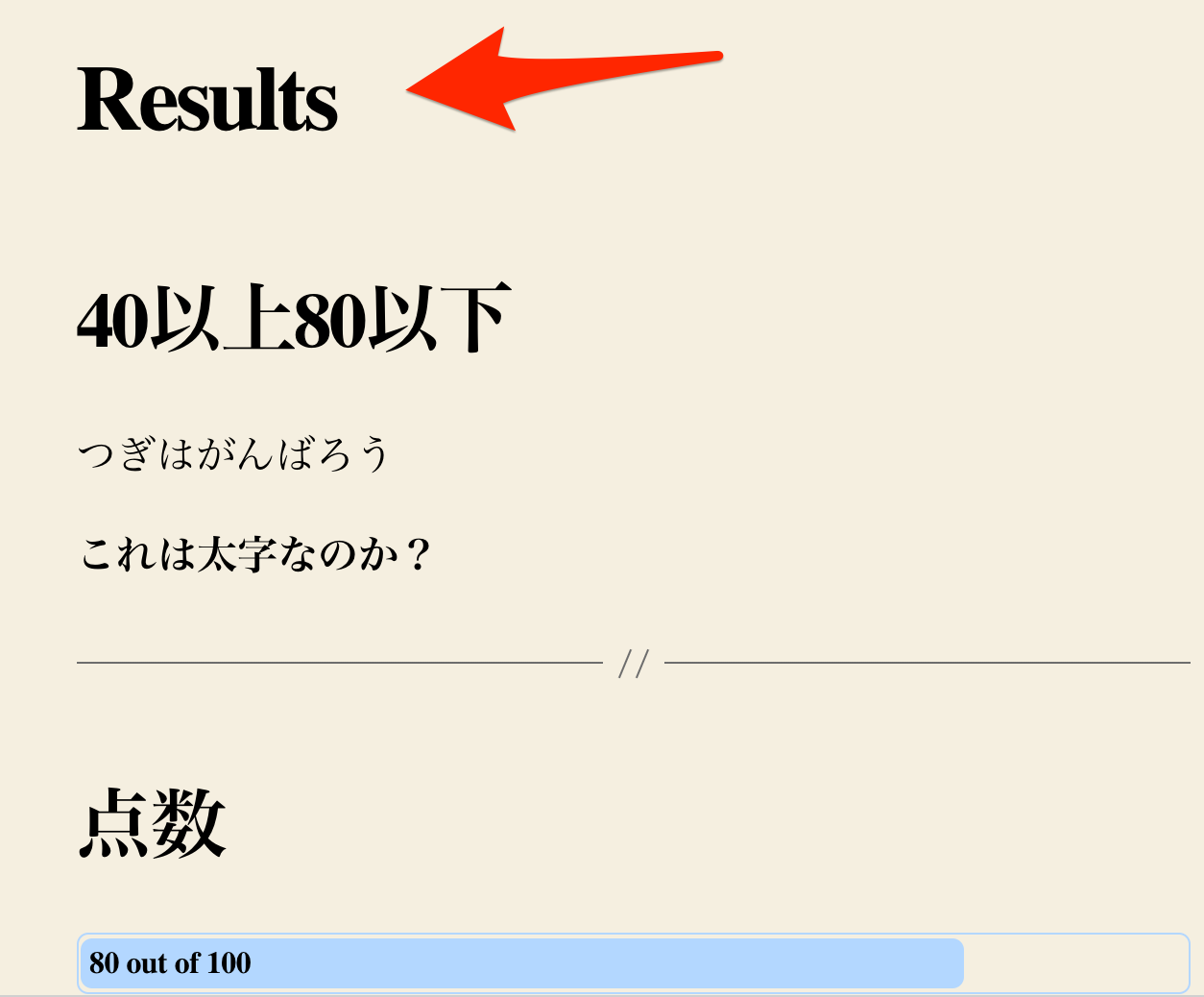 resultsというクラスのh2を text で指定した文字列で置き換えています。’テスト結果’を編集することで好きな文字にすることができます。
