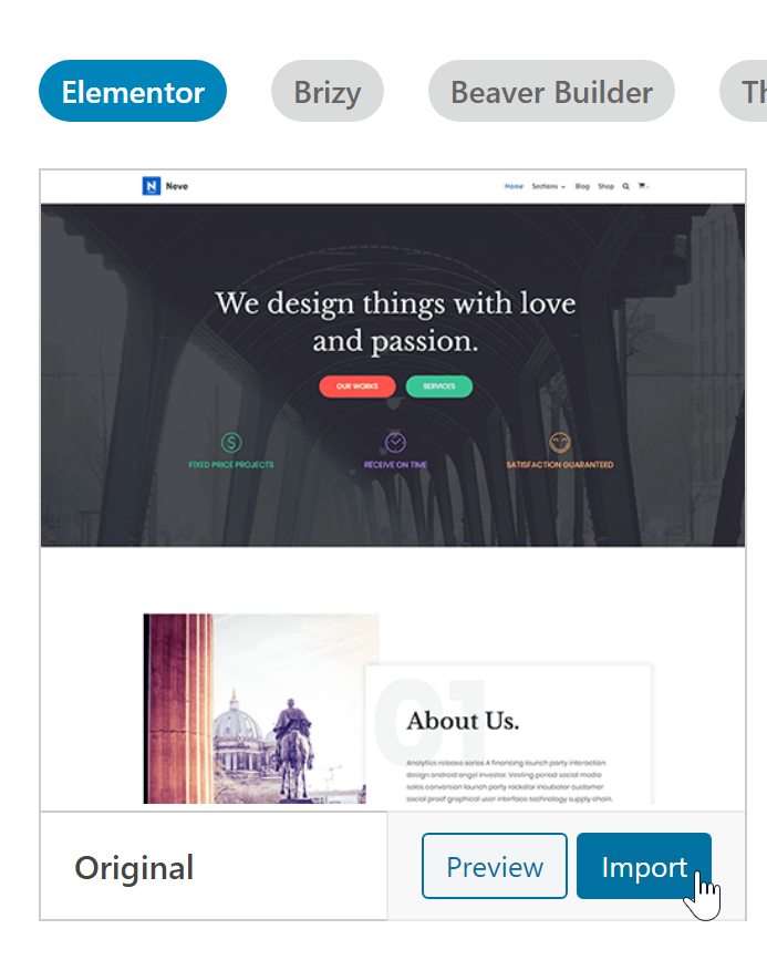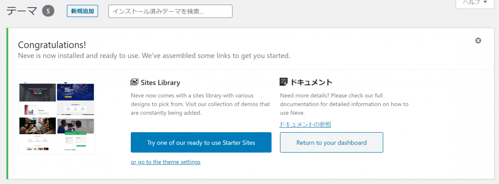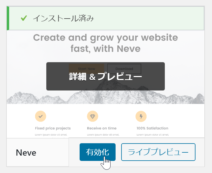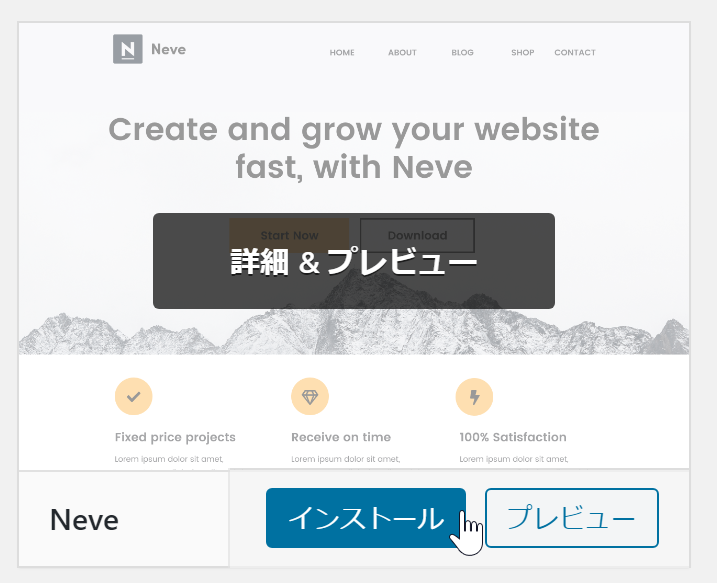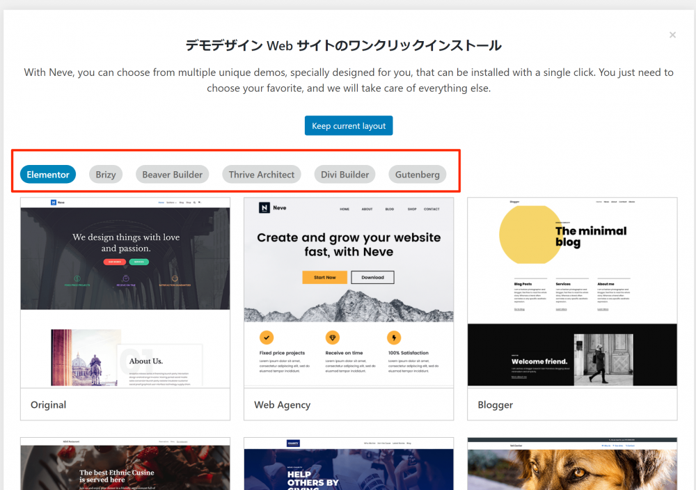 テーマ「Neve」の特徴は、Elementorが使えることとランディングページのサンプルコンテンツがインポートできること、です。