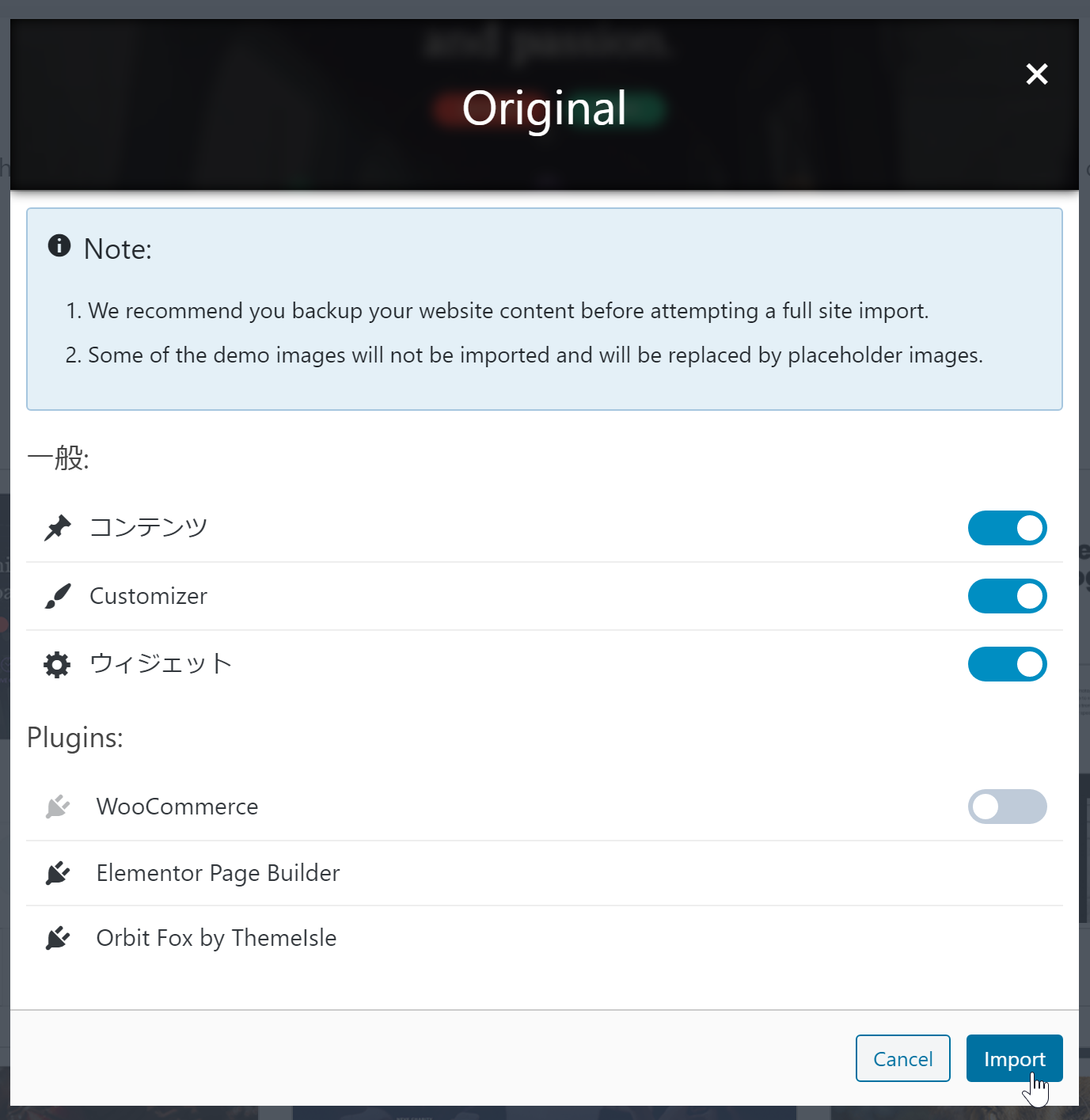 このサンプルコンテンツがインポートできること、がとても重要でした。私のようにデザイナーでなく、固定ページもあまり作ったことのない人間が「ランディングページを作ろう!」とおもったところで、一体何をどんな風に並べればいいんだろう?ということが全然わからないのでそういう人にはこのサンプルコンテンツがインポートできるということはとても役立つものでした。