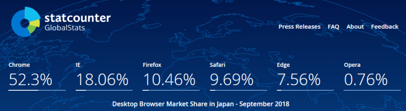 このようにChromeが52.3%と1位になっていました。この統計ではWindowsとMacが分けられないので、Safariも入っていますが、Macを除けばもっと多い数字になるのではないかと思います。