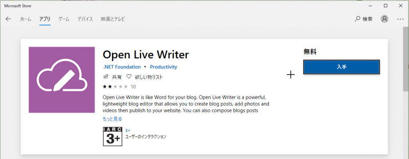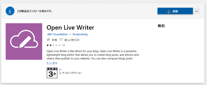 検索テキストボックスで open live と入力するとOpen Live Writerが表示されるので、クリック