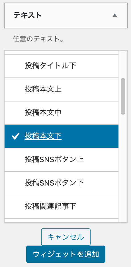 テキストウィジェットを選んで、投稿本文下をクリックし、ウィジェットを追加をクリック