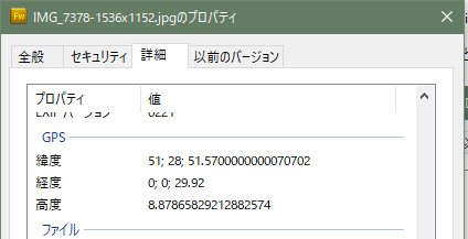 保存した写真ファイルの、プロパティを見てみるとGPSという項目自体がなくなってました。