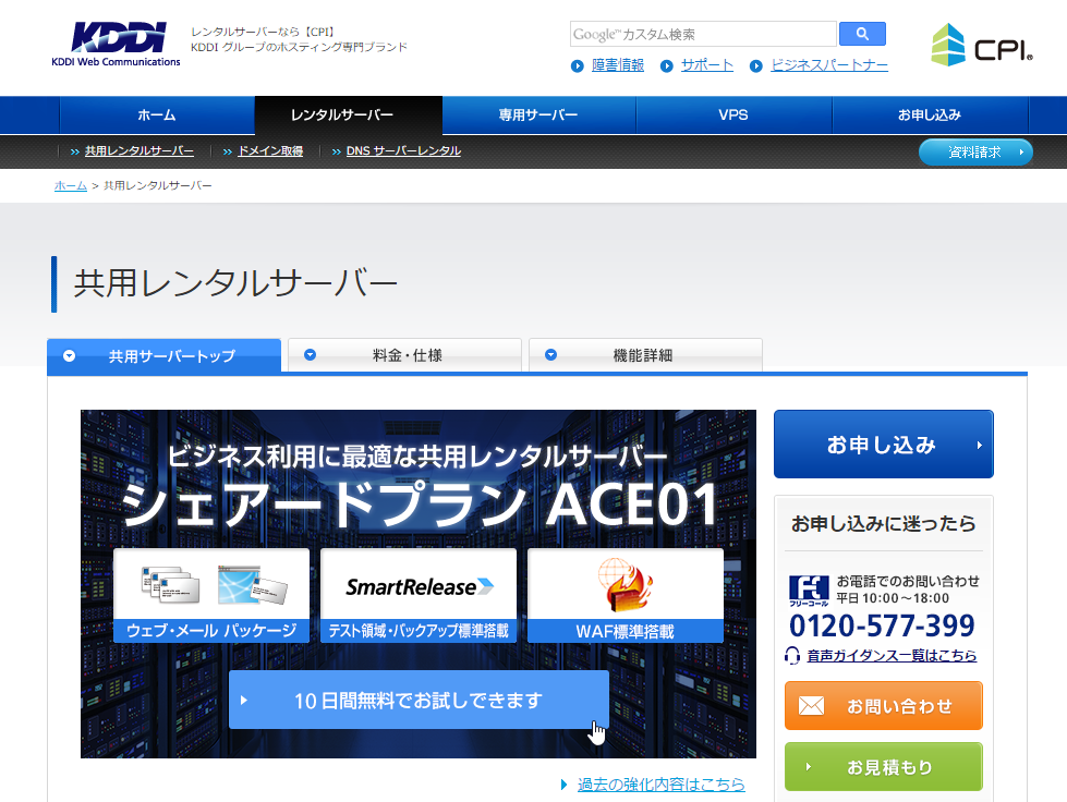 今回はちょっと高機能なプランについて書きたいと思います。KDDIグループのホスティング専用ブランドであるCPIのシェアードプランACE01です。どのように高機能なのかということと、実際に無料試用を申し込んでWordPressをインストールするまでについて書きたいと思います。