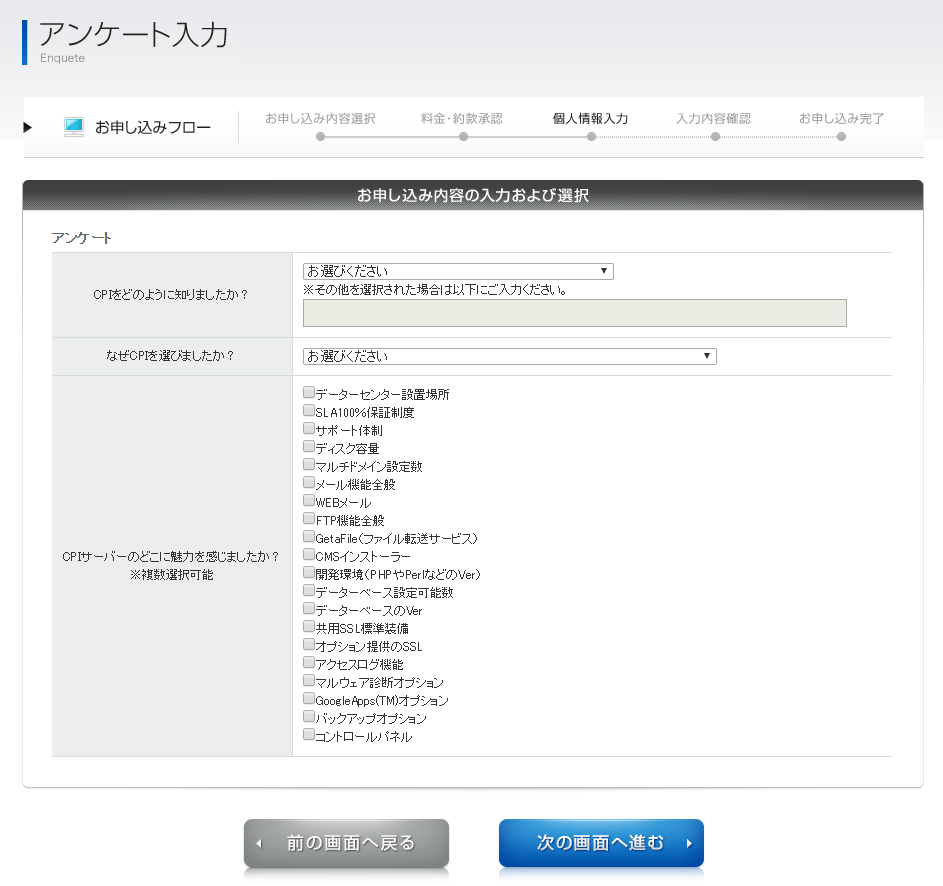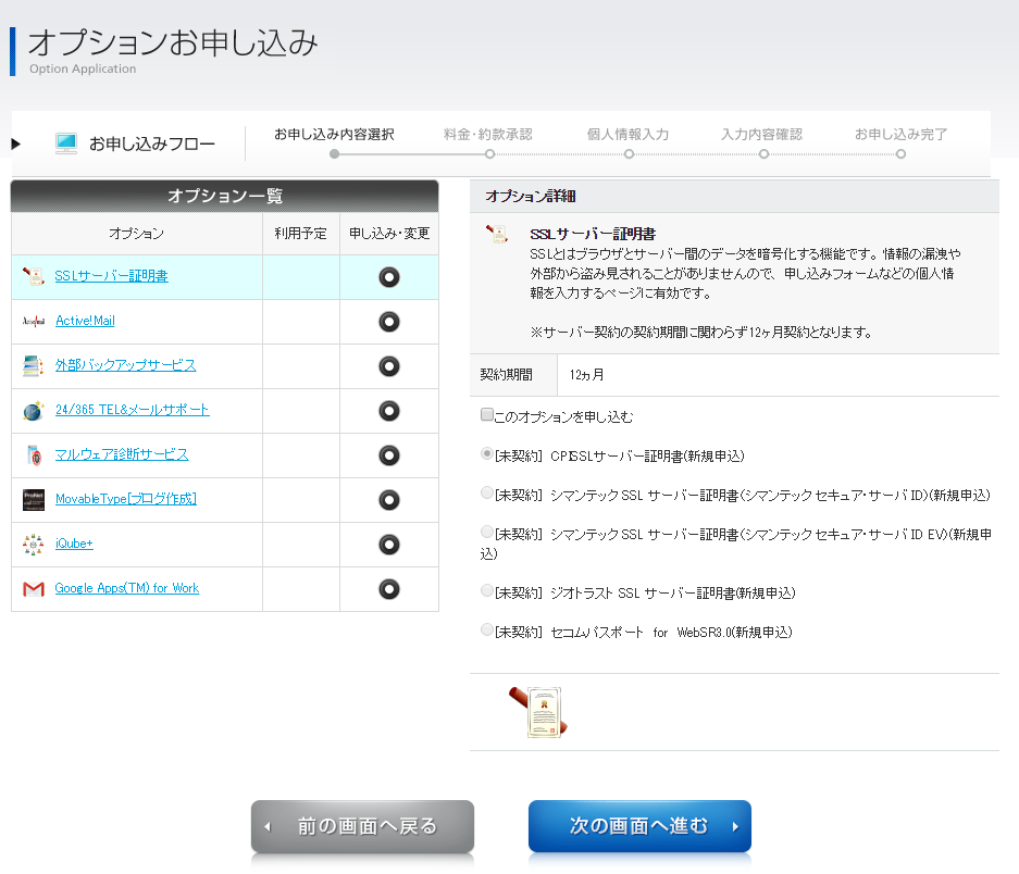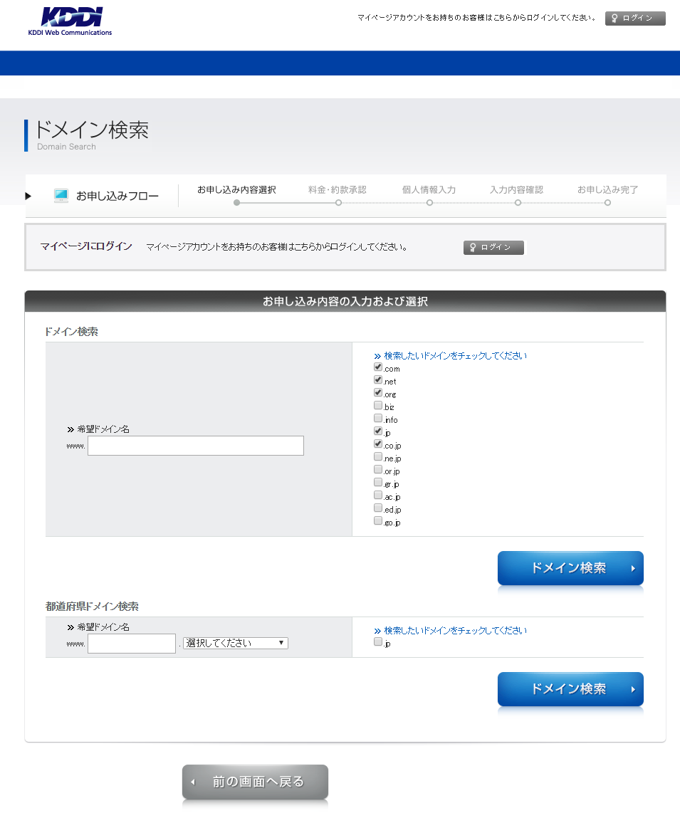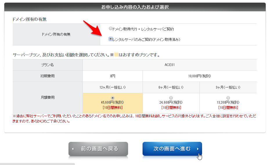 ドメイン所有の有無 のところで レンタルサーバのみ契約(ドメイン取得済み) にチェックを入れて進みました。