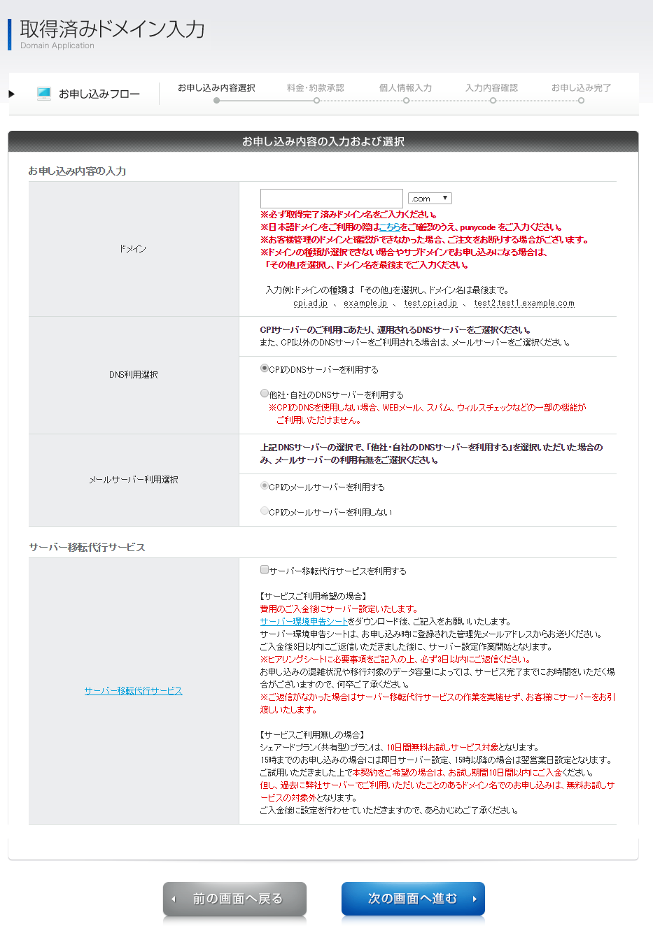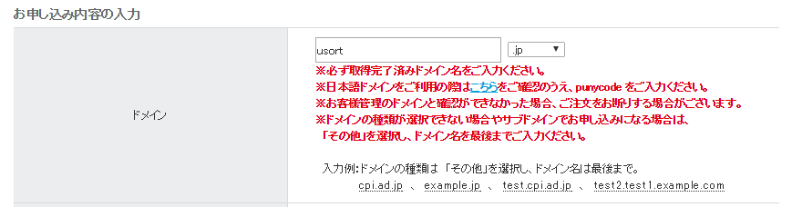 取得済みドメイン入力 の画面になります。ここで、取得済みのドメイン名を入れますがサポートに聞いたところ