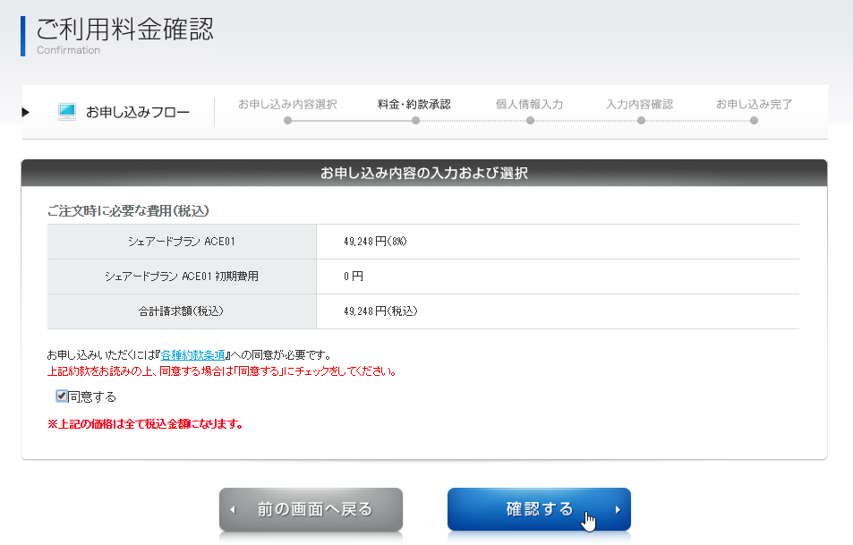 料金の確認画面です。税込だと49,248円となります。同意する にチェックを入れて 確認する をクリック