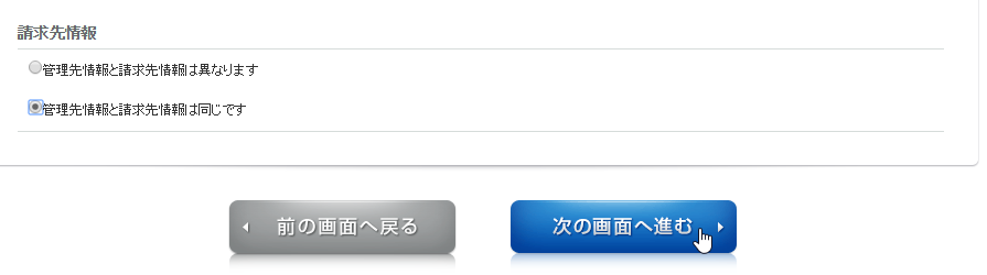 請求先情報 は 管理先情報と請求先情報は同じです の方にチェックをいれました。次の画面へ進む をクリック