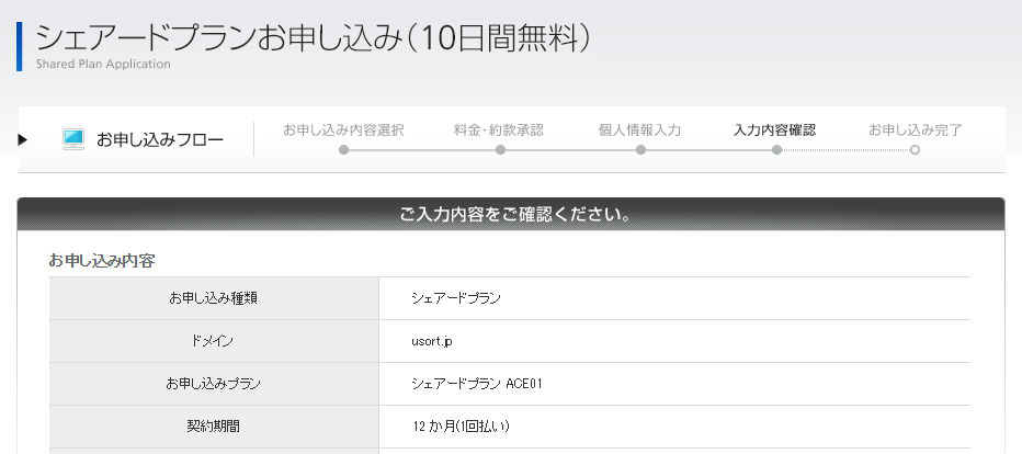 入力内容確認画面 です。内容を確認して お申し込み をクリック