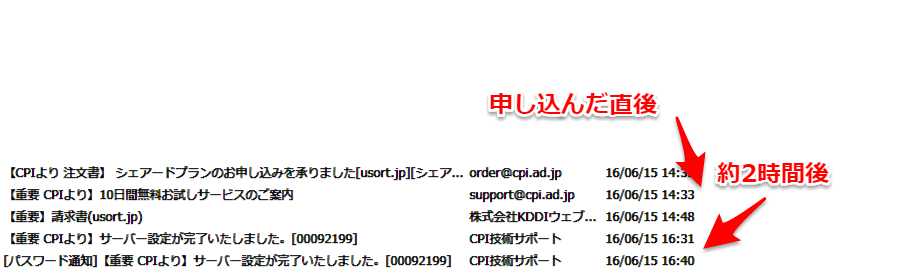 このように5通のメールが届きました。申し込んでからサーバーの設定ができるような情報が来るまでには約2時間10分ほどかかりました。平日であるかどうかなどの状況にもよると思いますが、だいたいこのぐらいかそれ以上は時間がかかると思っていると間違いないかと思います。