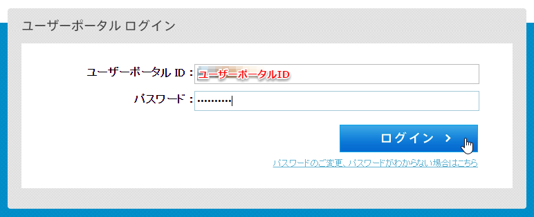 ユーザーポータルログイン という画面になるので ユーザーポータルIDに 先ほど開いたメールにあったユーザーポータルID を、パスワードは、[パスワード通知]【重要 CPIより】サーバー設定が完了いたしました。 というメールにある ユーザーポータル情報のパスワード を入力して