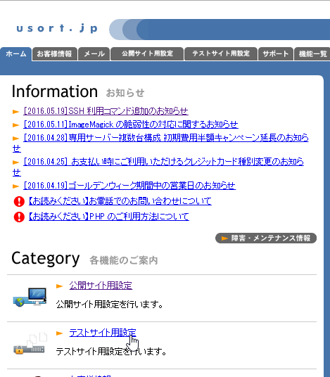 しかし、すぐにドメインを移転するわけではないから、試用はどのドメインで試すことになるの?と思いサポートの方にお聞きしたところ、テスト用のURLがあるようなのでそれで試用することができるということがわかりました。