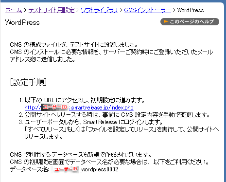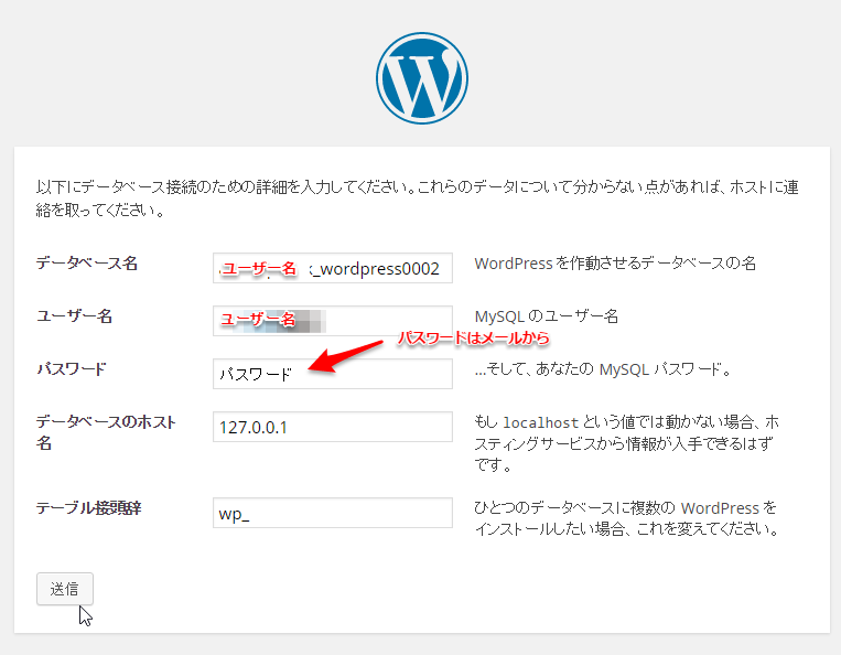 このように データベース名、ユーザー名、データベースのホスト名は既に入っているのであとはパスワードを
