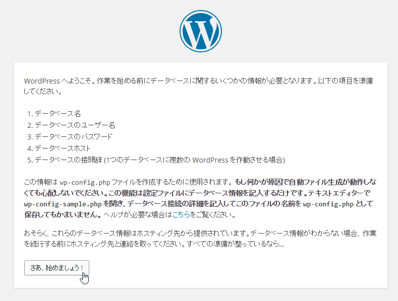 いつものWordPressインストール画面になります。さあ、始めましょう! をクリック