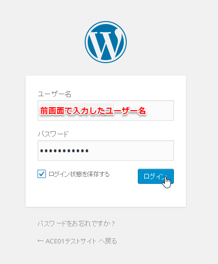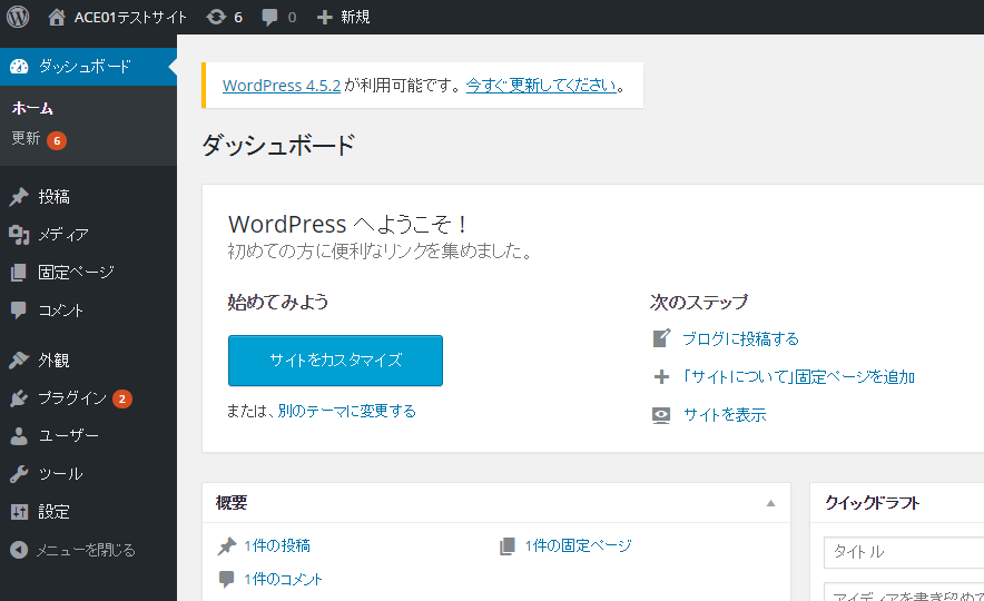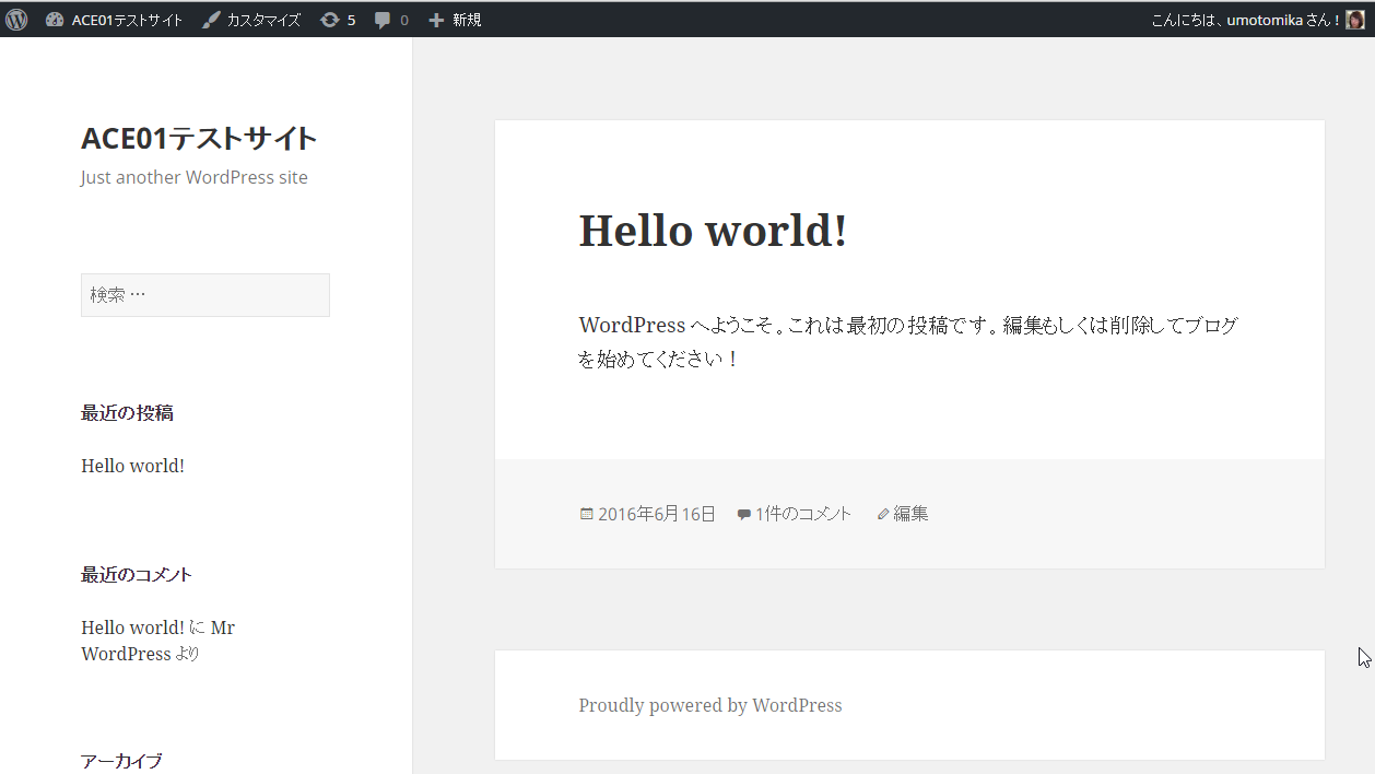 これで先ほどのページを再読込すると、ACE01テストサイト が表示されて、WordPressのインストールが完了しました。