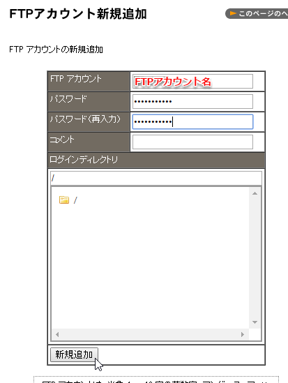 任意のFTPアカウント名とパスワードを入力して、新規追加をクリック