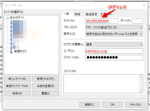 【重要 CPIより】サーバー設定が完了いたしました。 というメールにあるIPアドレスをホストに、ユーザにFTPアカウント名、パスワードにFTPアカウントのパスワードを入力して接続します。