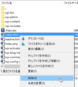 表示されるファイル一覧から index.html を右クリックして 削除 をクリックします
