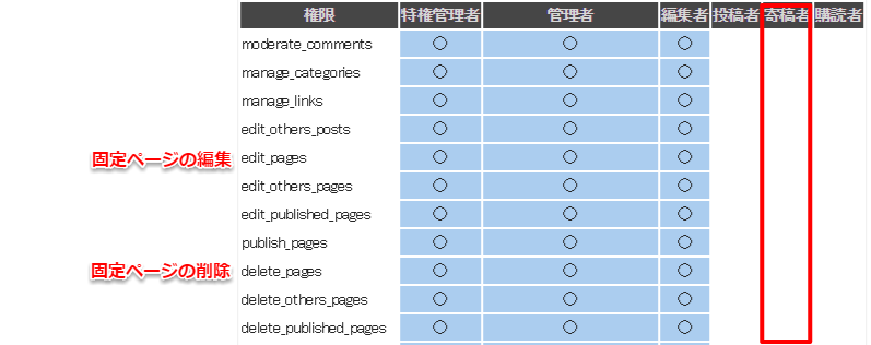 固定ページの編集、固定ページの削除 は寄稿者には権限がありませんでした。postはあくまでも投稿のことだったのですね。寄稿者だけでなく、固定ページを投稿できるのは管理者と編集者だけ、ということみたいです。