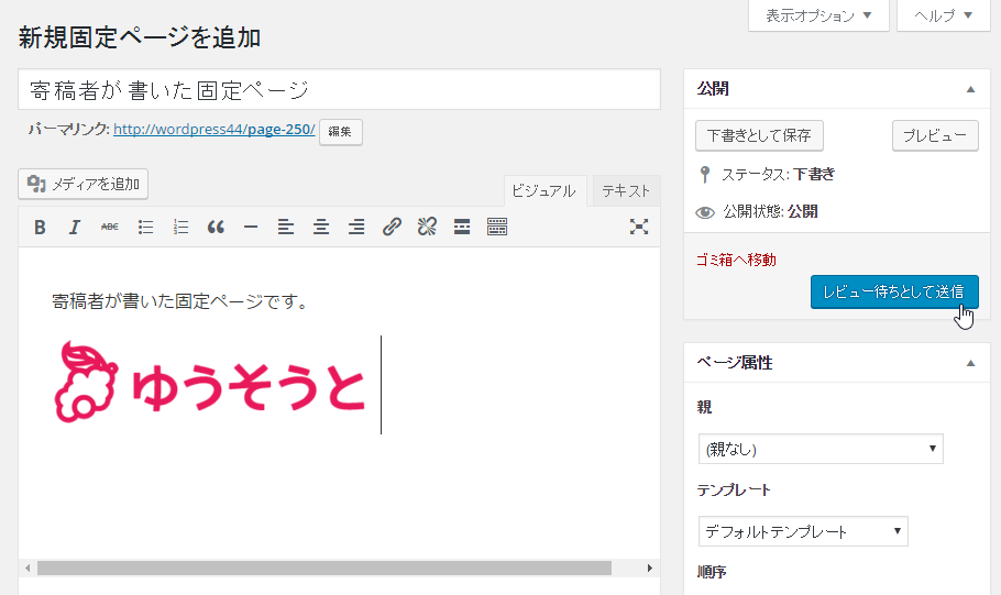 このように固定ページを書いて、レビュー待ちとして送信 をクリックしてみます。