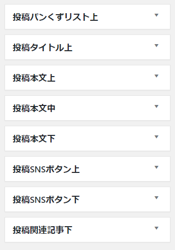 このように投稿に関するウィジェットエリアがたくさんあります。アフィリエイトをする方にSimplicityを使ってる方が多いのもこのウィジェットエリアの多さをみるとうなずけます。