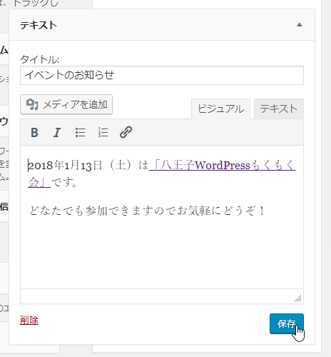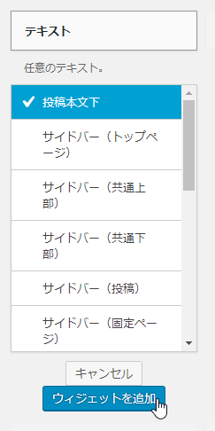 テキスト を選び、投稿本文下をクリックしてからウィジェットを追加をクリック