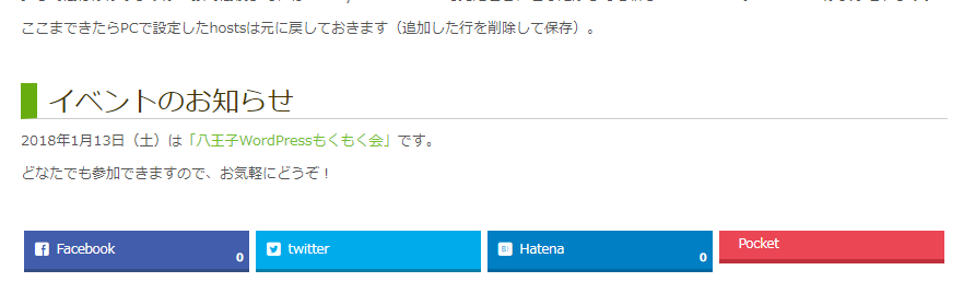 というのもLightningで推奨されているVkExUnitというプラグインを入れてSNSボタンなどを表示させていると、本文を表示させる部分の the_content に、SNSボタンなどの表示も入った状態で返ってきてしまうからです。LightningとVkExUnitの組み合わせだけでなく、このようになる可能性は他のテーマやプラグインなどの組み合わせの場合もあるような気がしました。