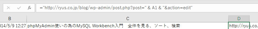D列に編集用のURLが表示されました。URLがリンクしていないようだったので隣のE列に