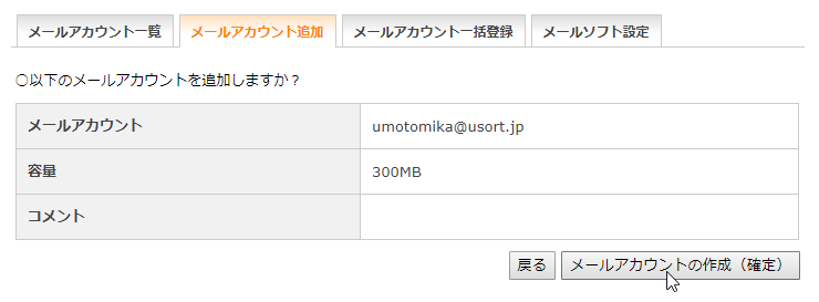 メールアドレスやパスワードを入力して(後で必要ですのでパスワードはメモしておいて下さい)、メールアカウントの作成(確認)をクリック